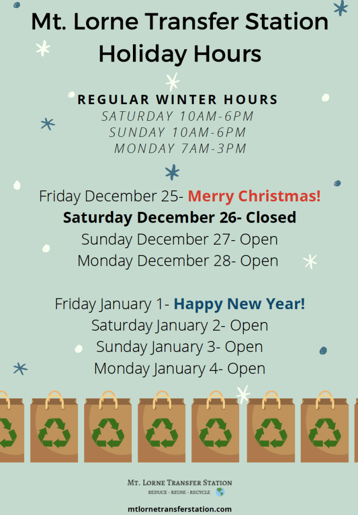 Mt. Lorne Transfer Station Holiday Hours π Posted byMt. Lorne Transfer StationDecember 11, 2020Posted inUncategorized mt.-lorne-announcements-Download Share this: Click to share on X (Opens in new window) X Click to share on Facebook (Opens in new window) Facebook Like Loading... Related