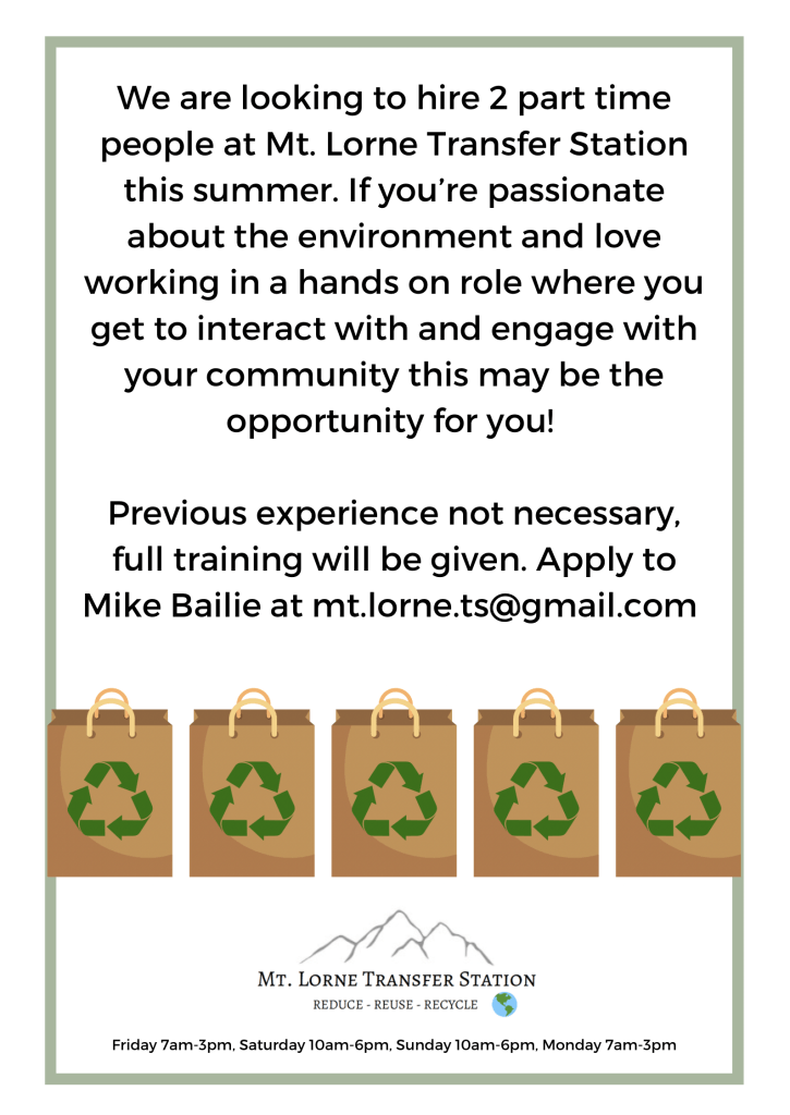 We are hiring! Posted byMt. Lorne Transfer StationApril 9, 2022Posted inUncategorized Share this: Click to share on X (Opens in new window) X Click to share on Facebook (Opens in new window) Facebook Like Loading... Related