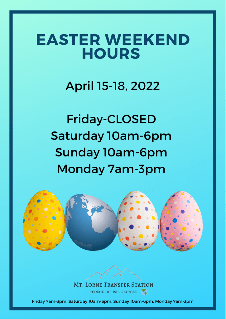 Easter Weekend Hours Posted byMt. Lorne Transfer StationApril 14, 2022Posted inUncategorized Share this: Click to share on X (Opens in new window) X Click to share on Facebook (Opens in new window) Facebook Like Loading... Related